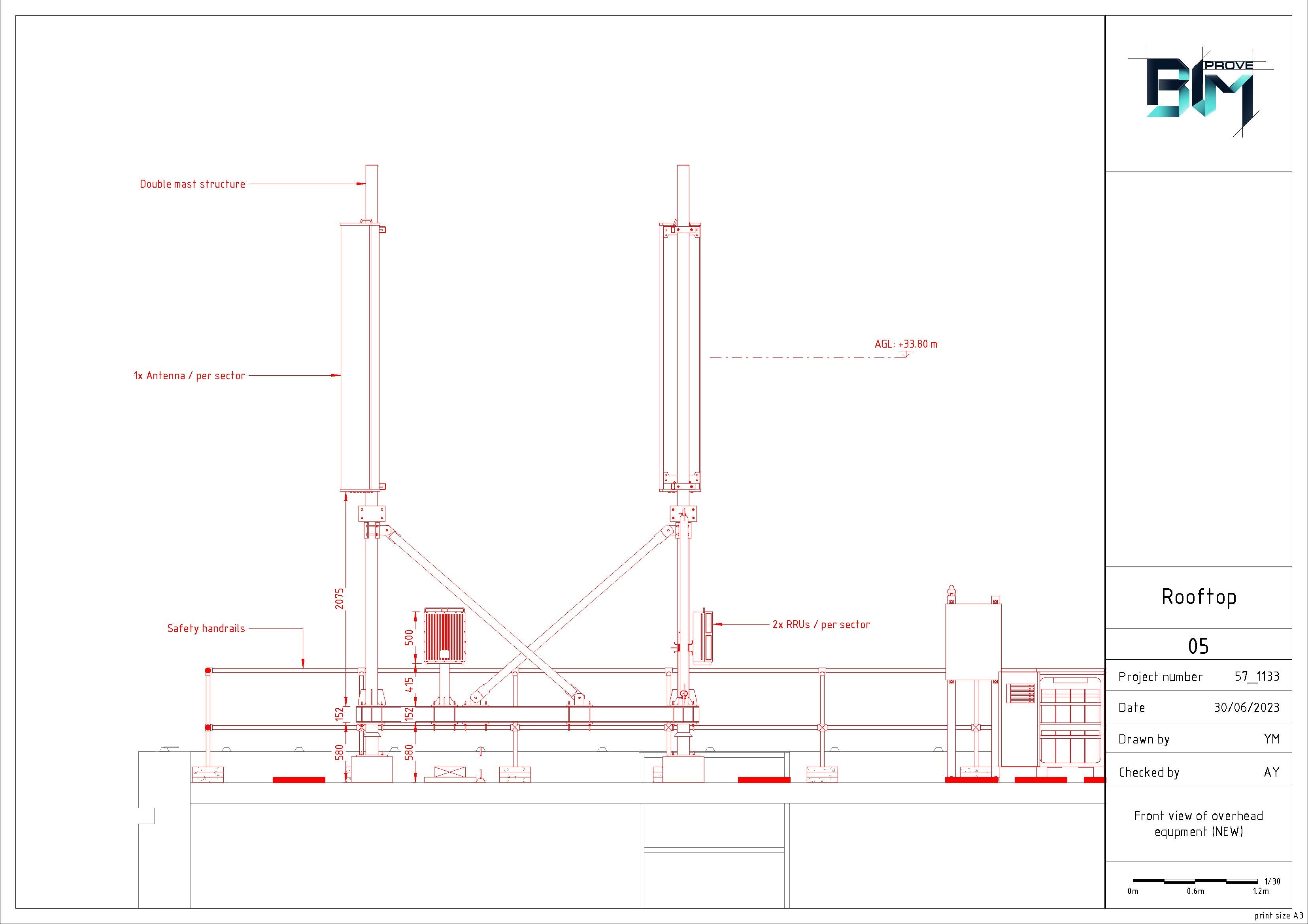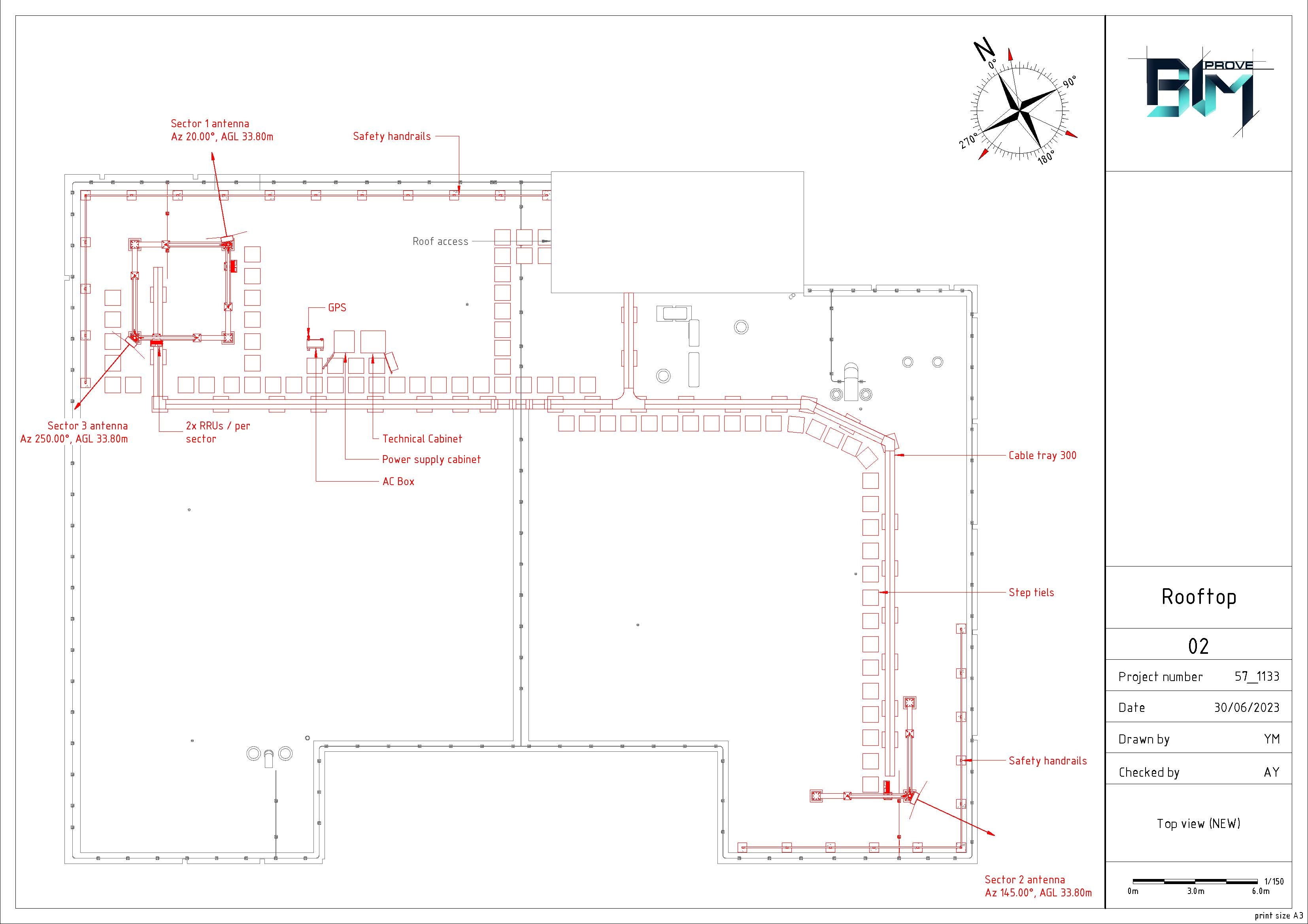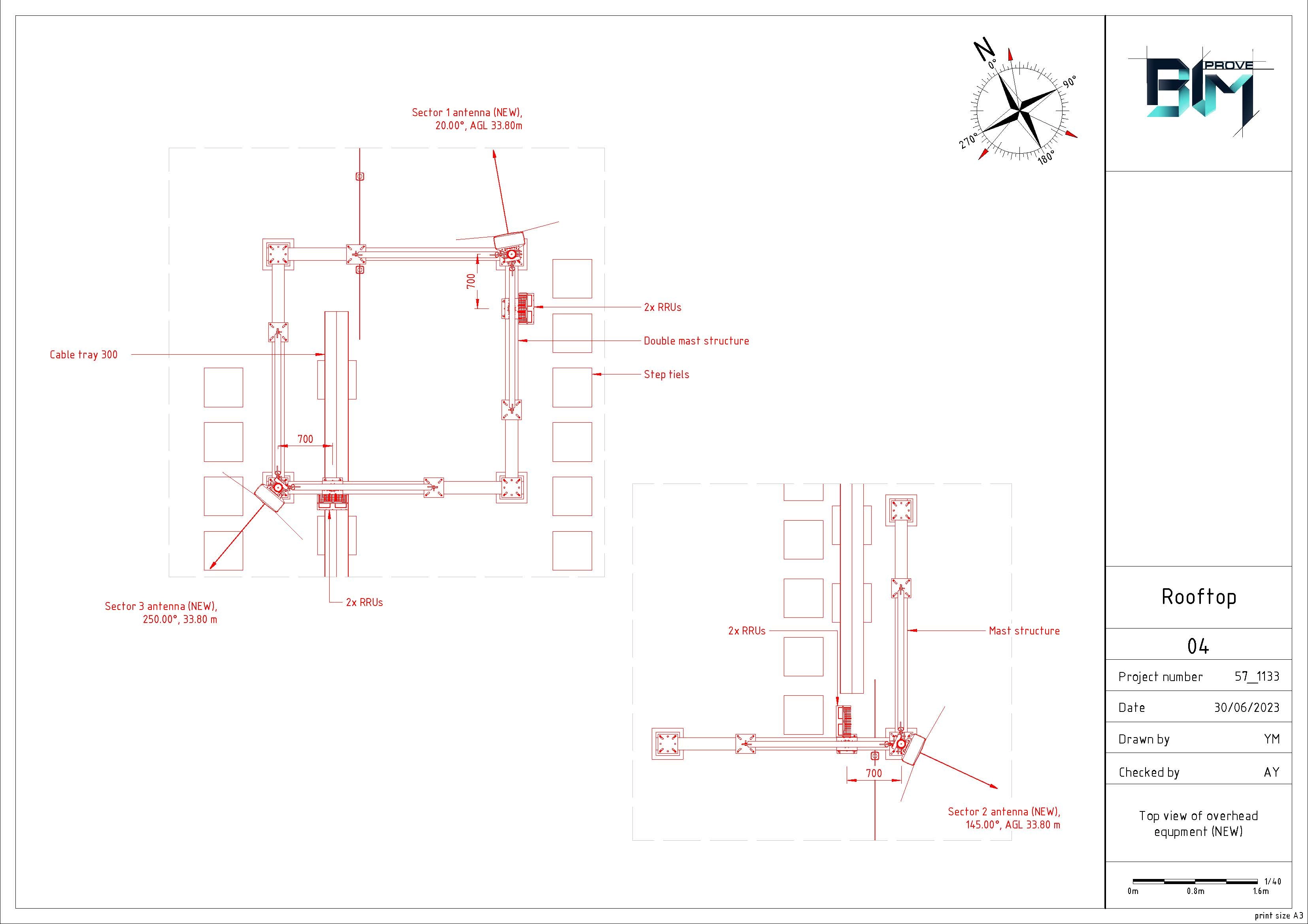 Modeling of the building by point cloud. Modeling of 2 steel structures with equipment (Antennas, RRU, cabinets) for 3 sectors and cable trays between them. Safety objects. Production drawings