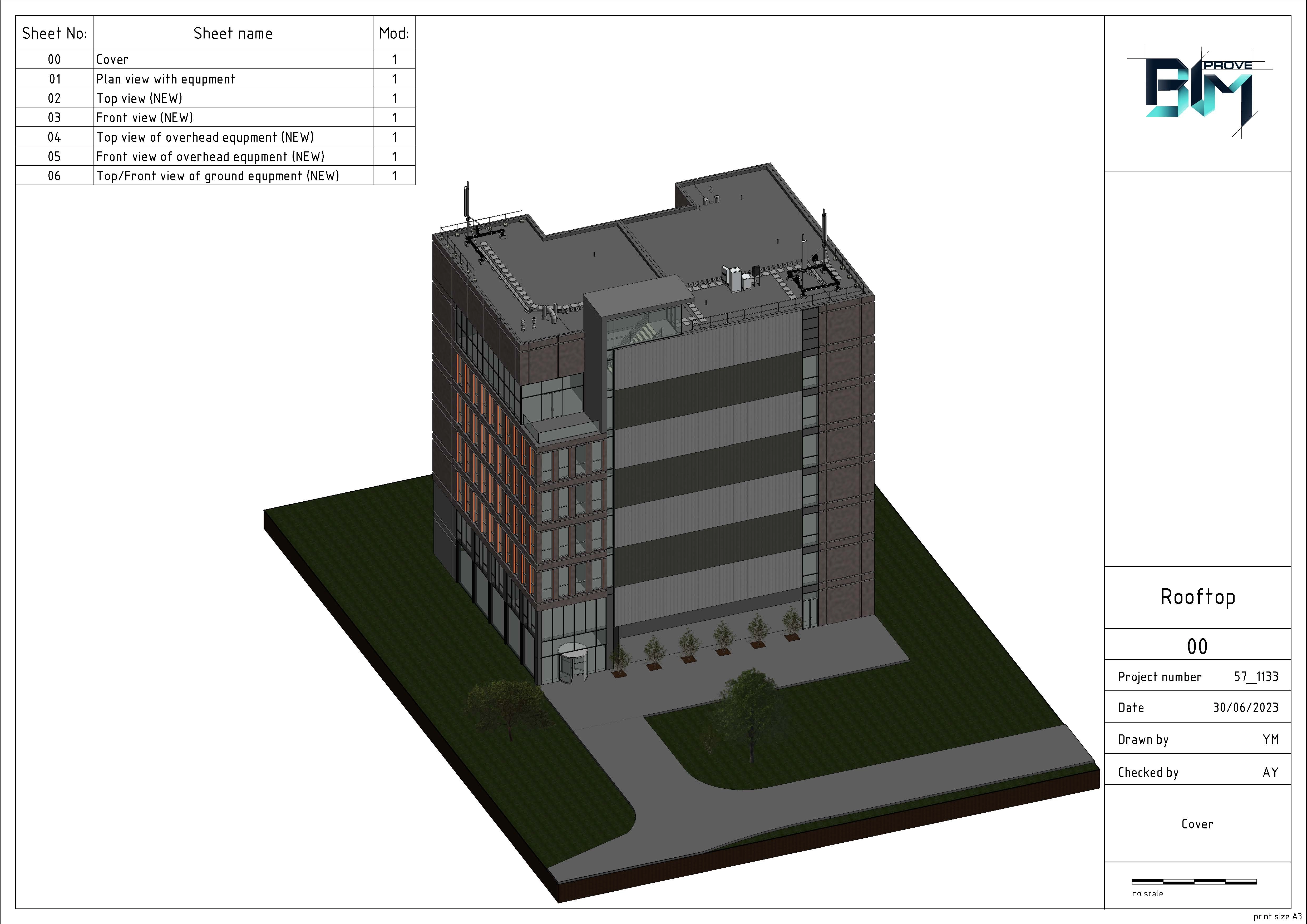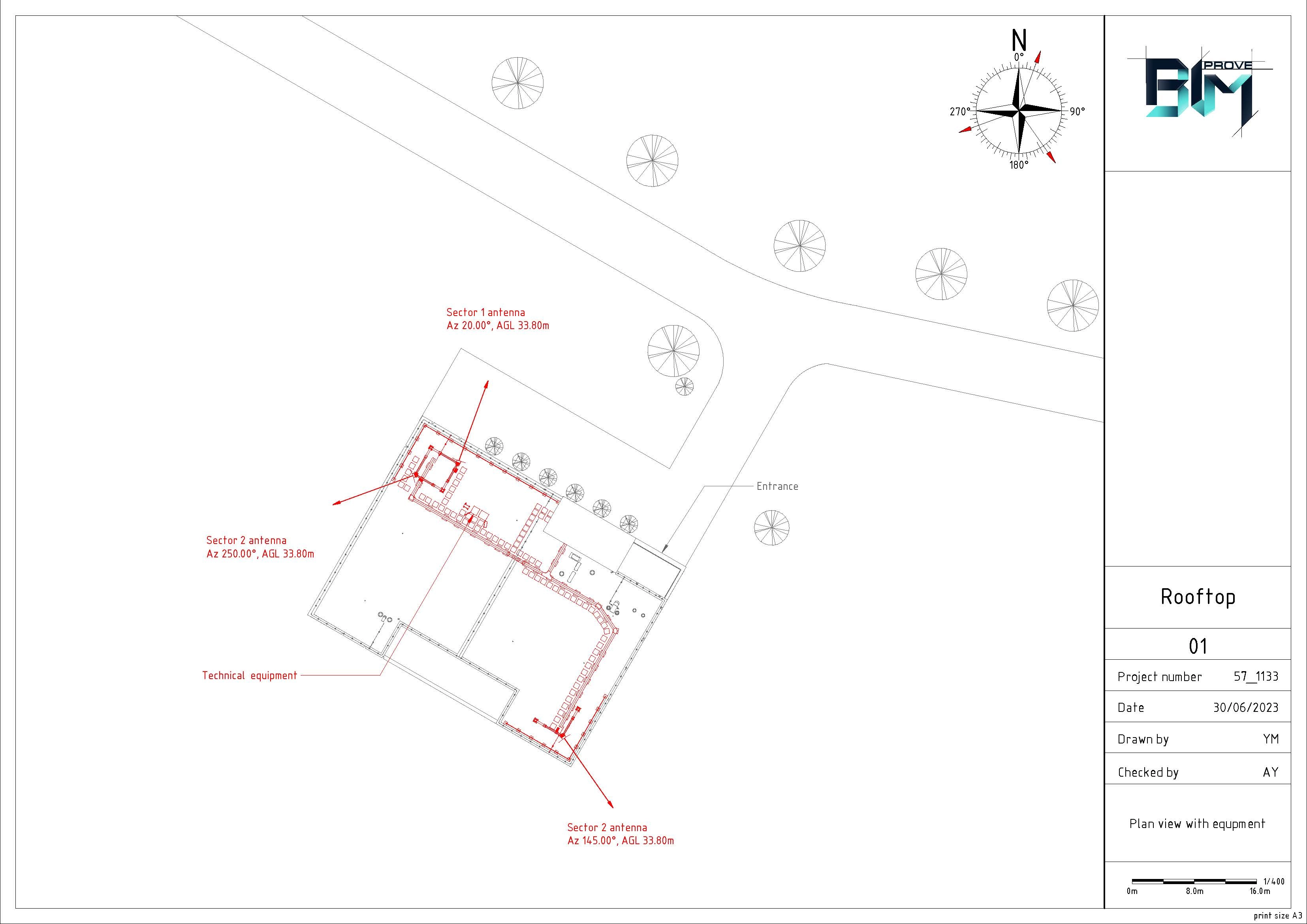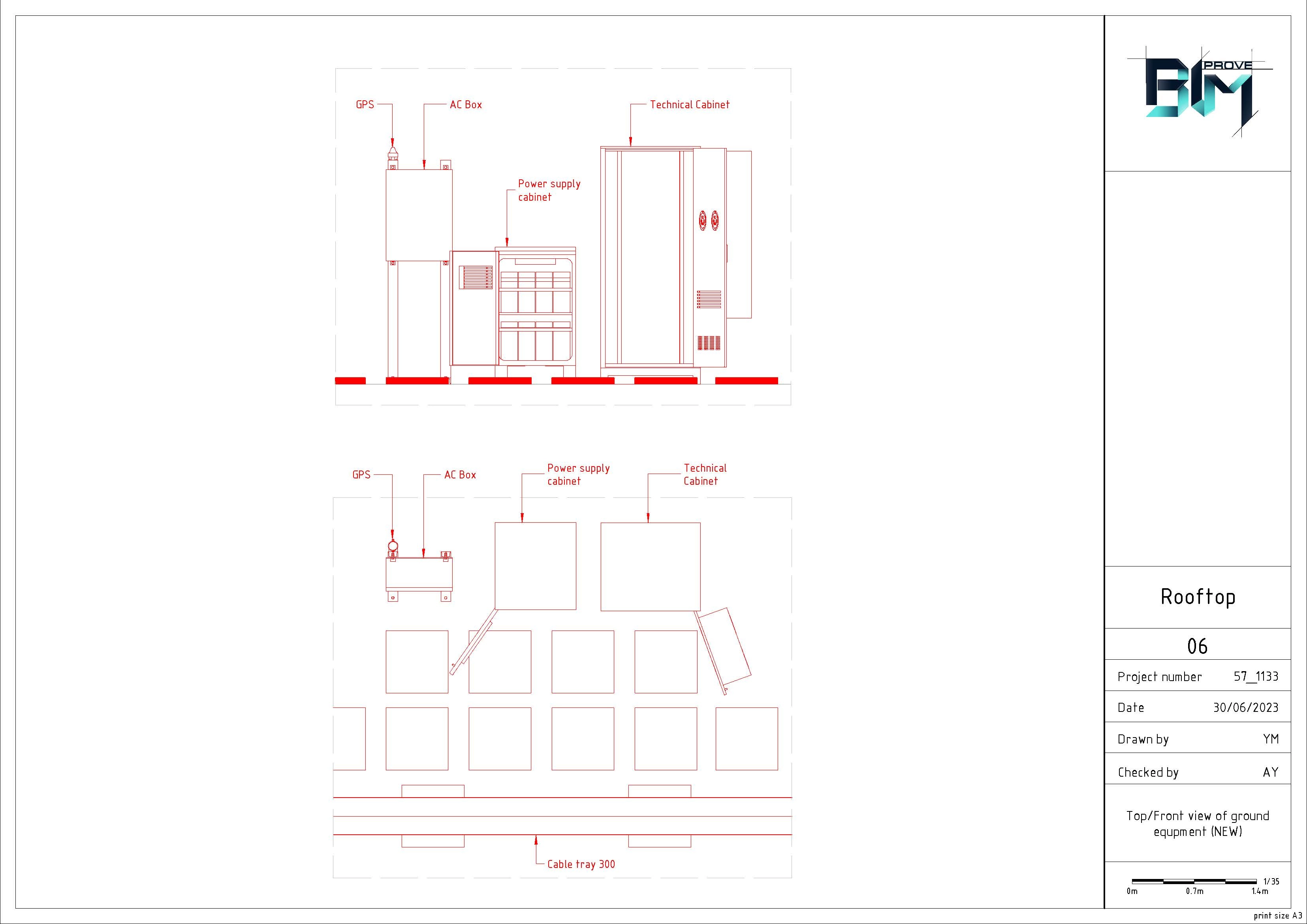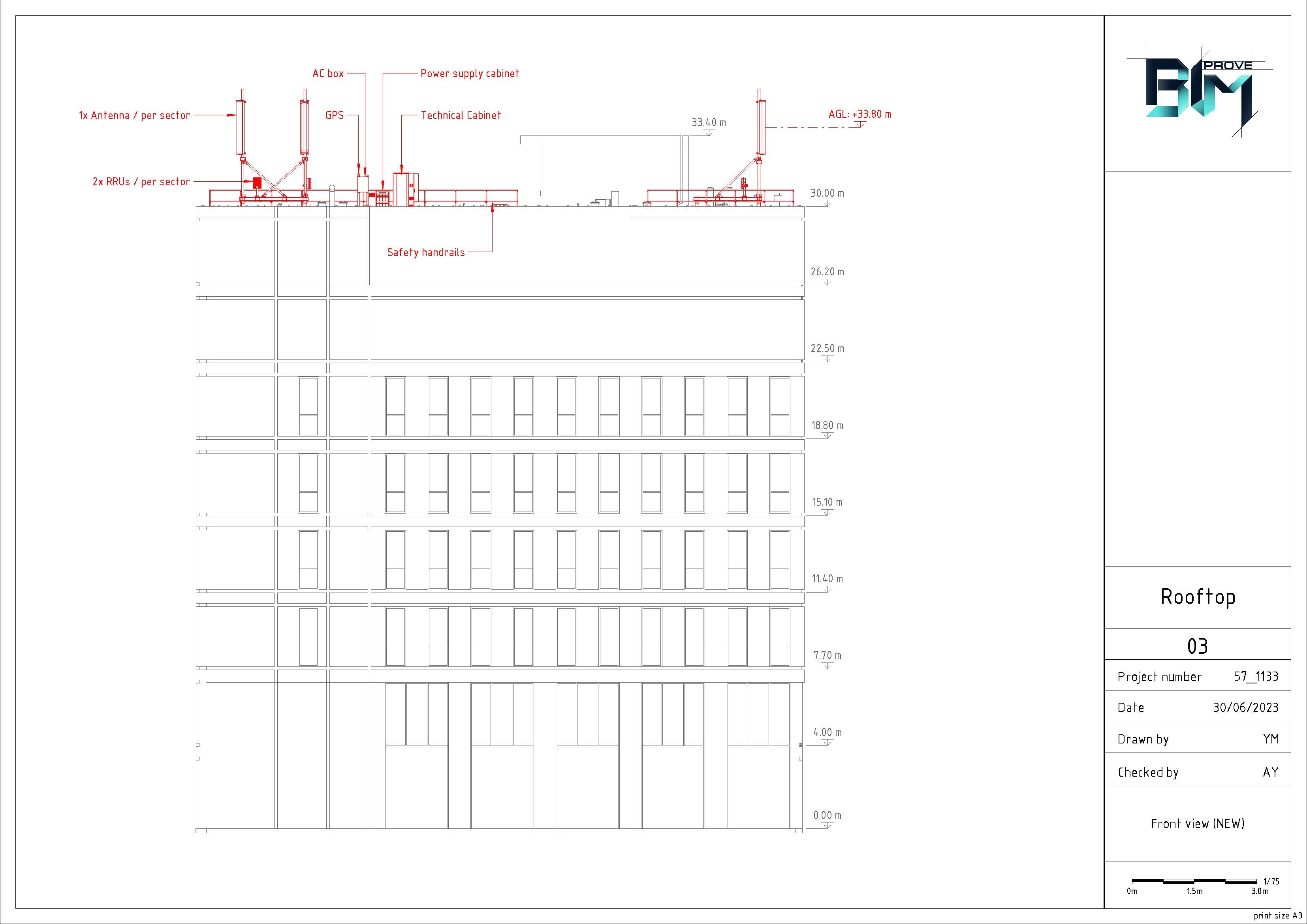 Modeling of the building by point cloud. Modeling of 2 steel structures with equipment (Antennas, RRU, cabinets) for 3 sectors and cable trays between them. Safety objects. Production drawings